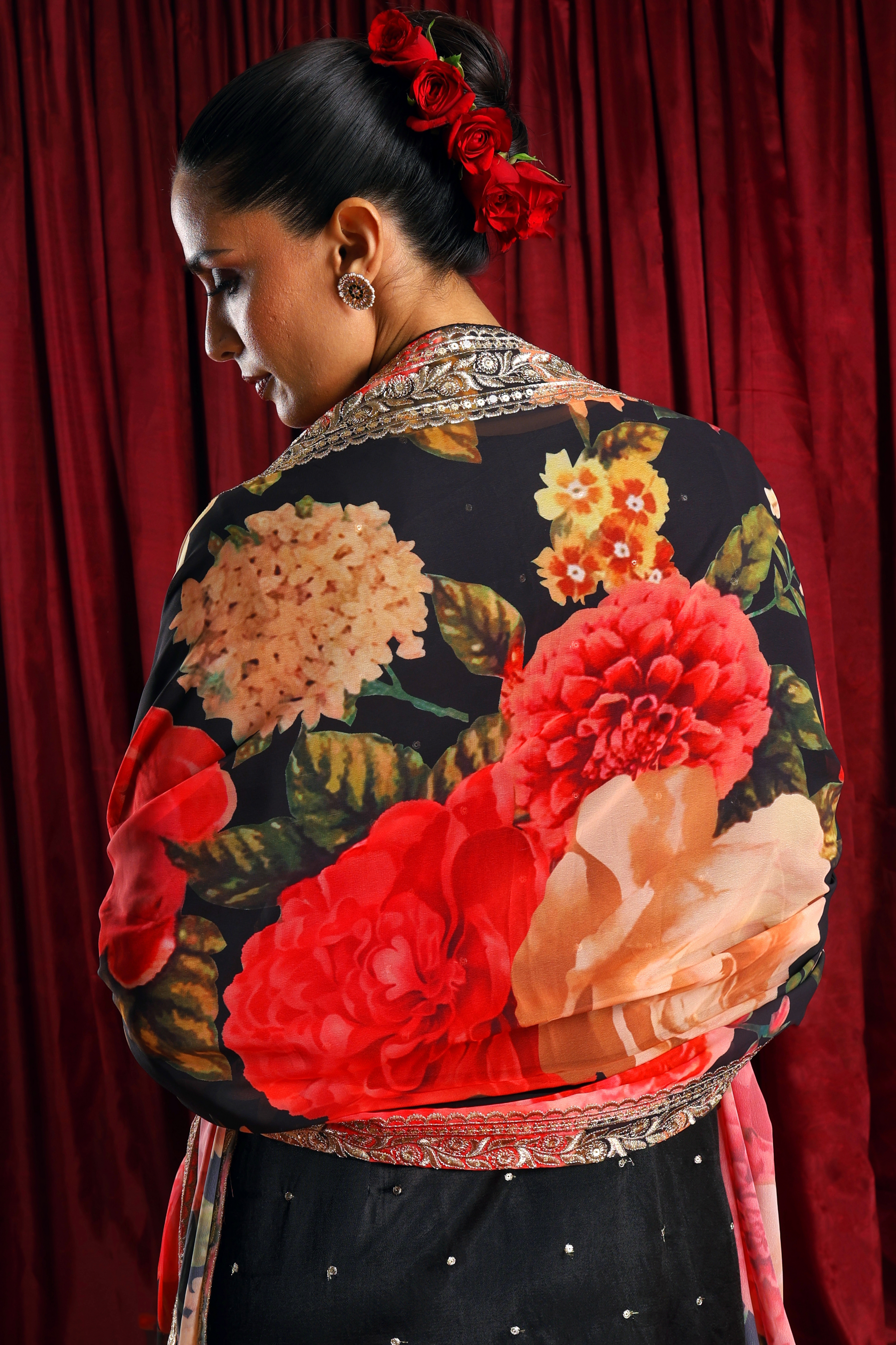 A Gorgeous black kurta in gajji silk fabric with sequence embroidery. Its paired with black lycra churidar and a beautiful printed dupatta with embroidery