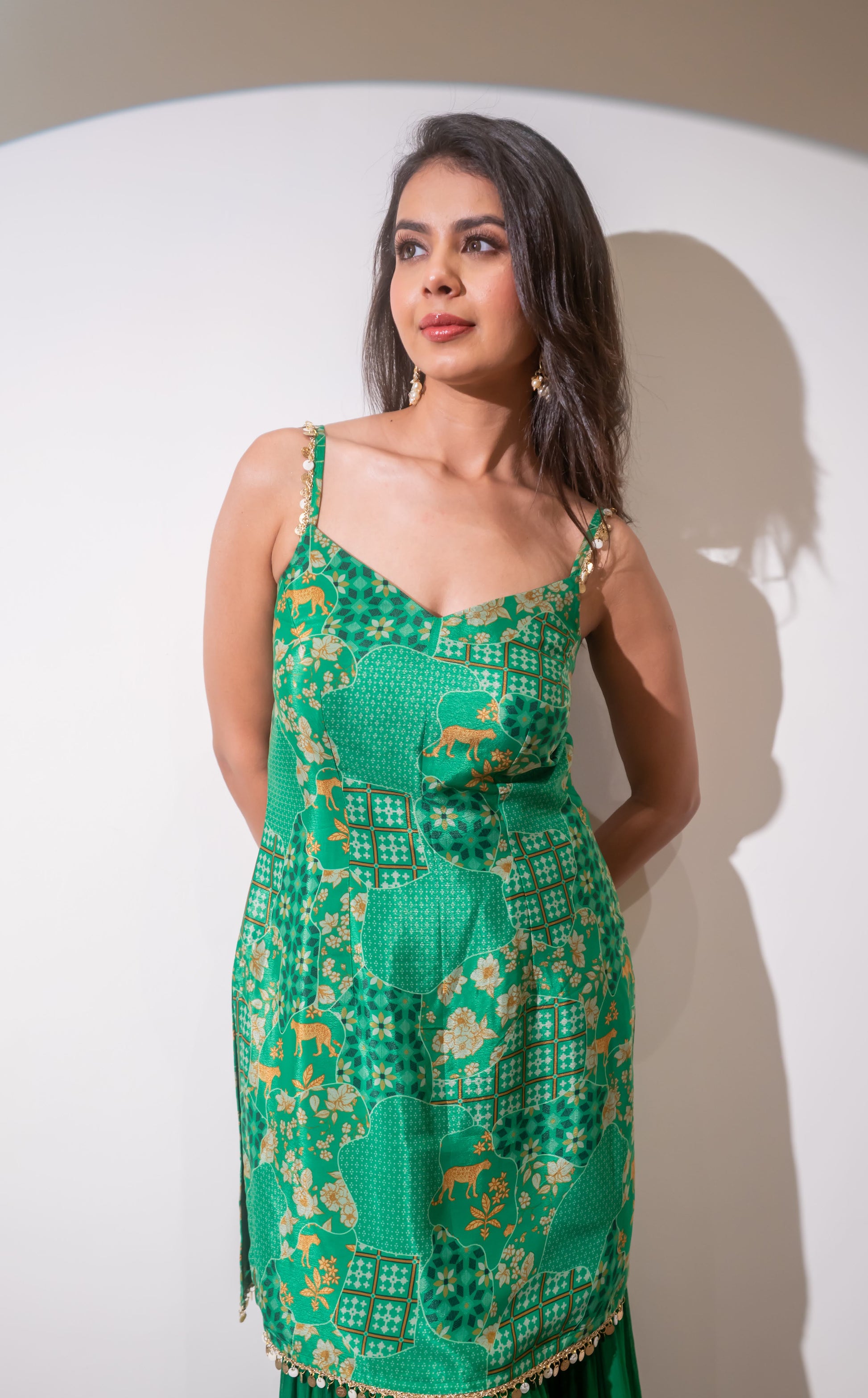 Beautiful mehndi green printed crepe kurta with delicate detailing on straps with a georgette sharara. it comes with a dupatta with embroidery detailing.