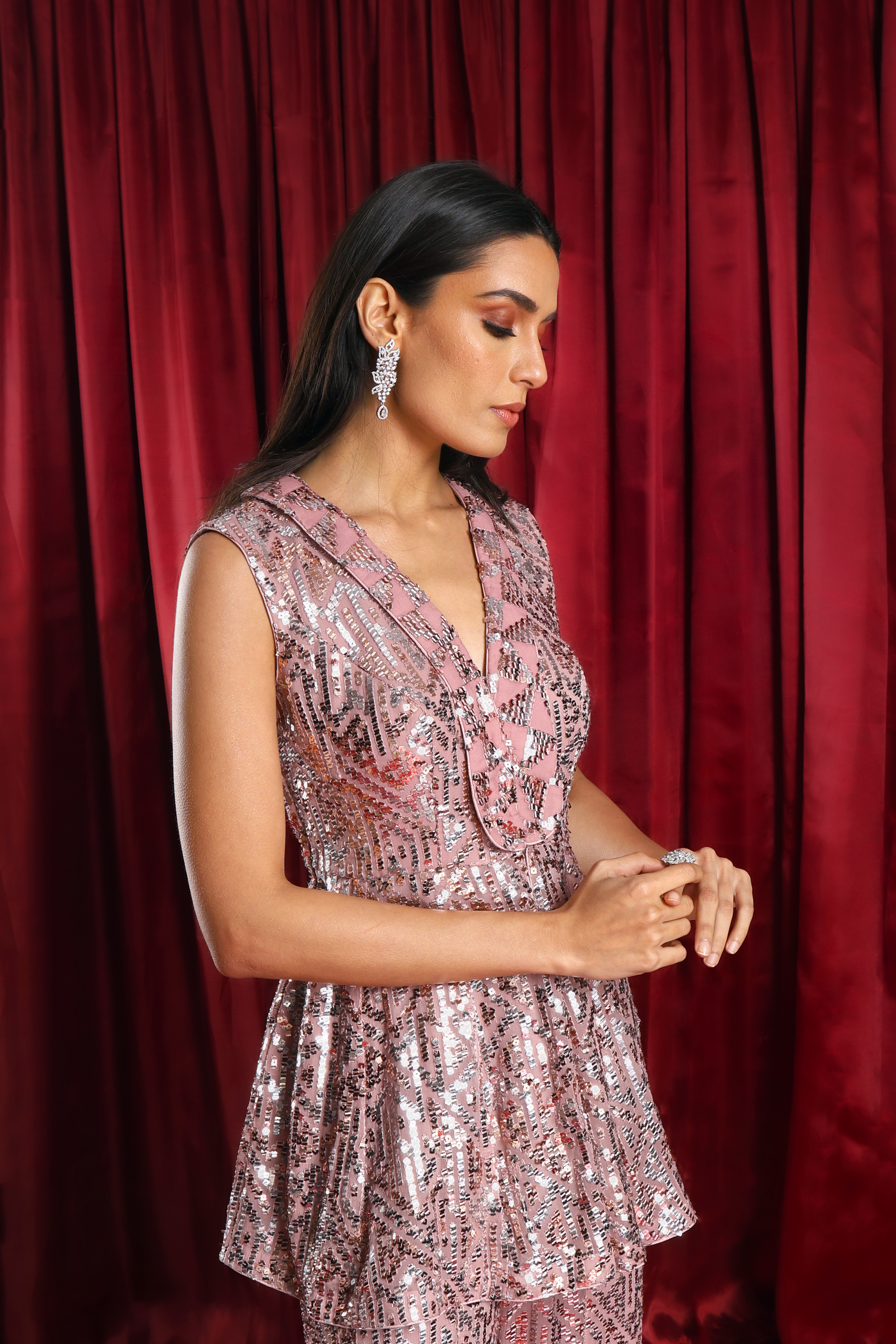 Rose gold Indo-western sequins cord set in a blush pink base colour, fabric used is georgette.